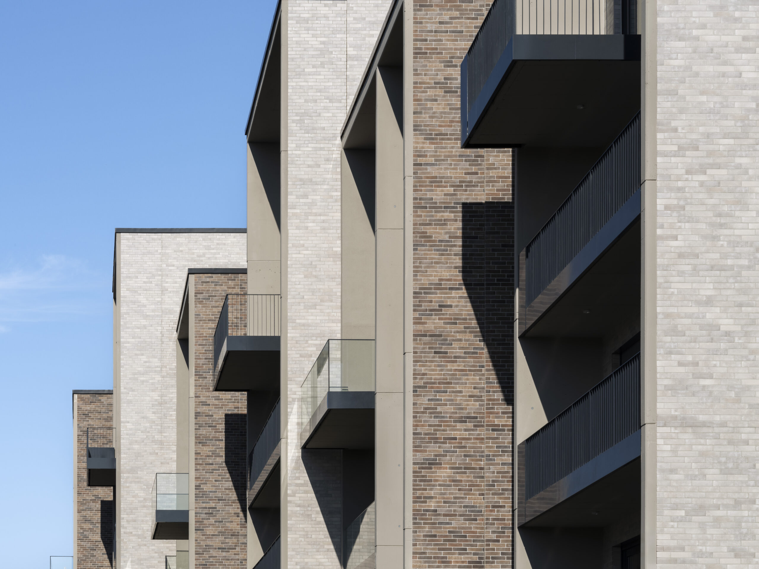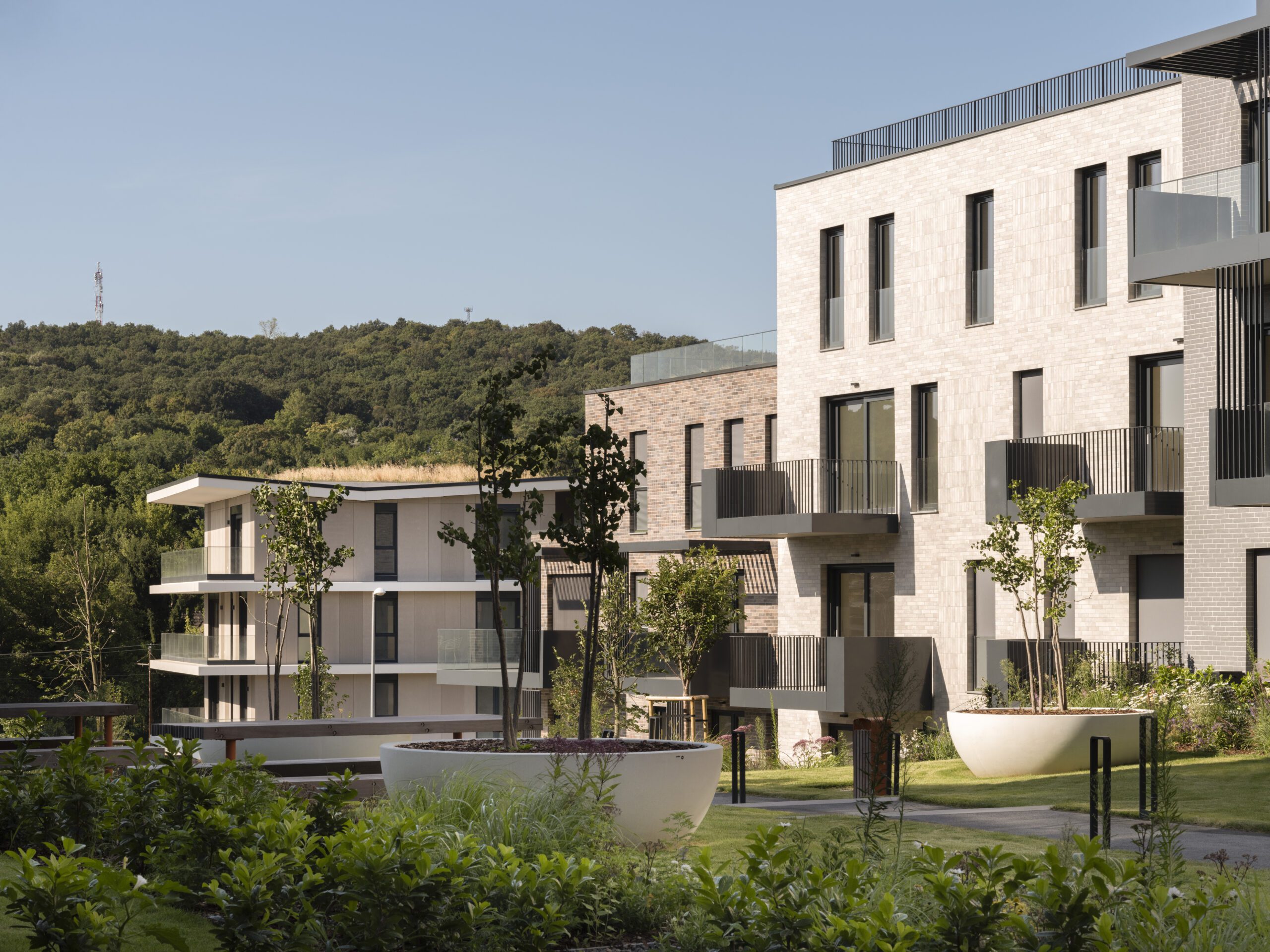 Sustainability and wellbeing are central to the design. A geothermal energy system, rainwater retention, green roofs, biodiversity corridors, and generous communal spaces reduce environmental impact while encouraging residents to spend time outdoors. Distinct materials and façade details give each cluster its own identity while blending into the natural setting, while the housing itself is marked by exceptional qualities such as large floor areas, transversal apartments with dual orientations, and multi-level apartments that create a unique residential offer in the city.